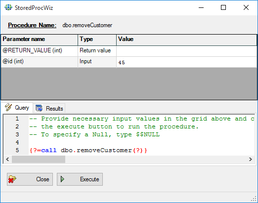 Using WinSQL Professional, you can execute and capture the results of a stored procedure using the Stored Procedure Wizard. Select the stored procedure from the Catalog Details window, right-click it, and then select Execute Procedure. A window similar to the following displays: